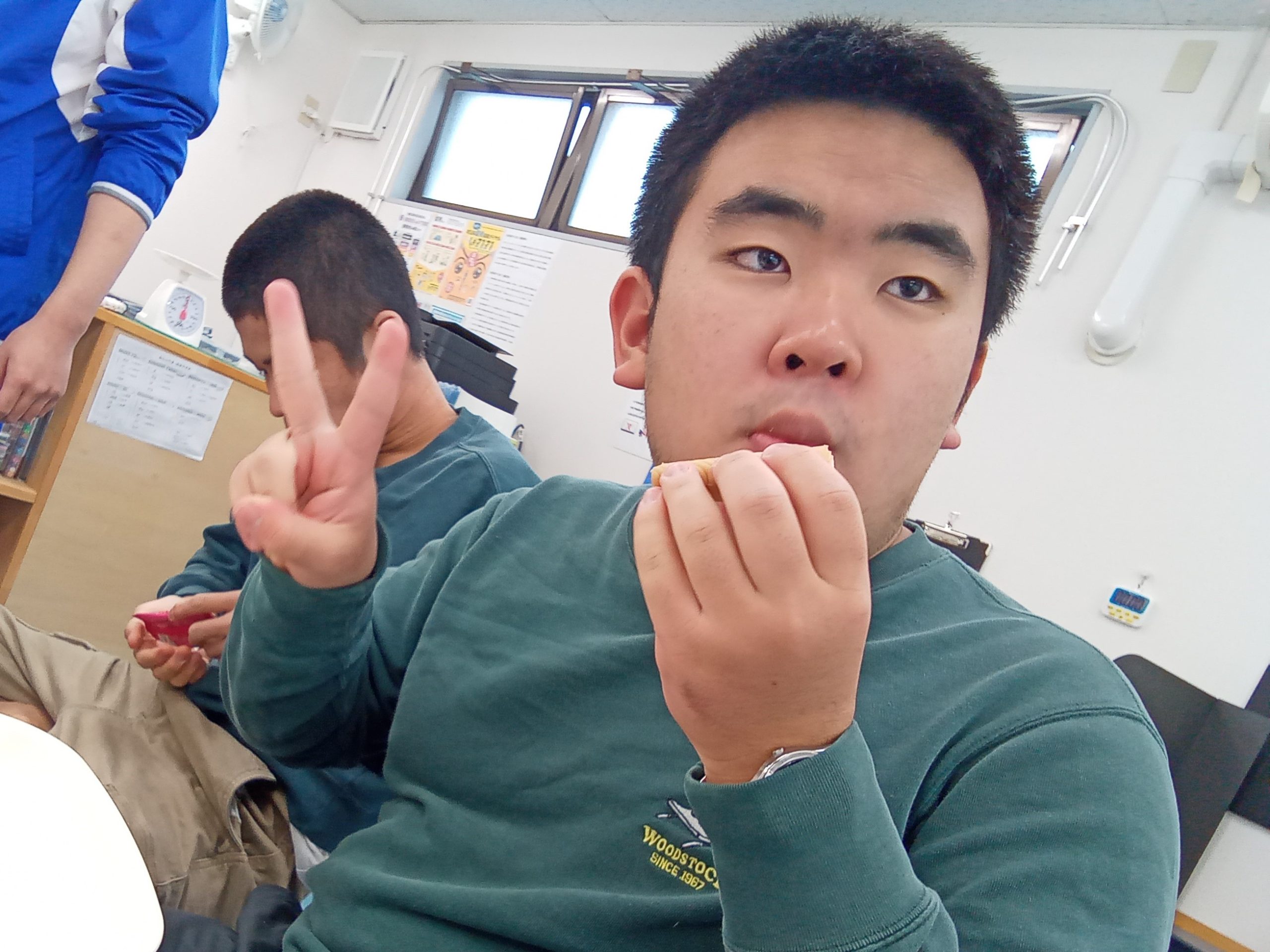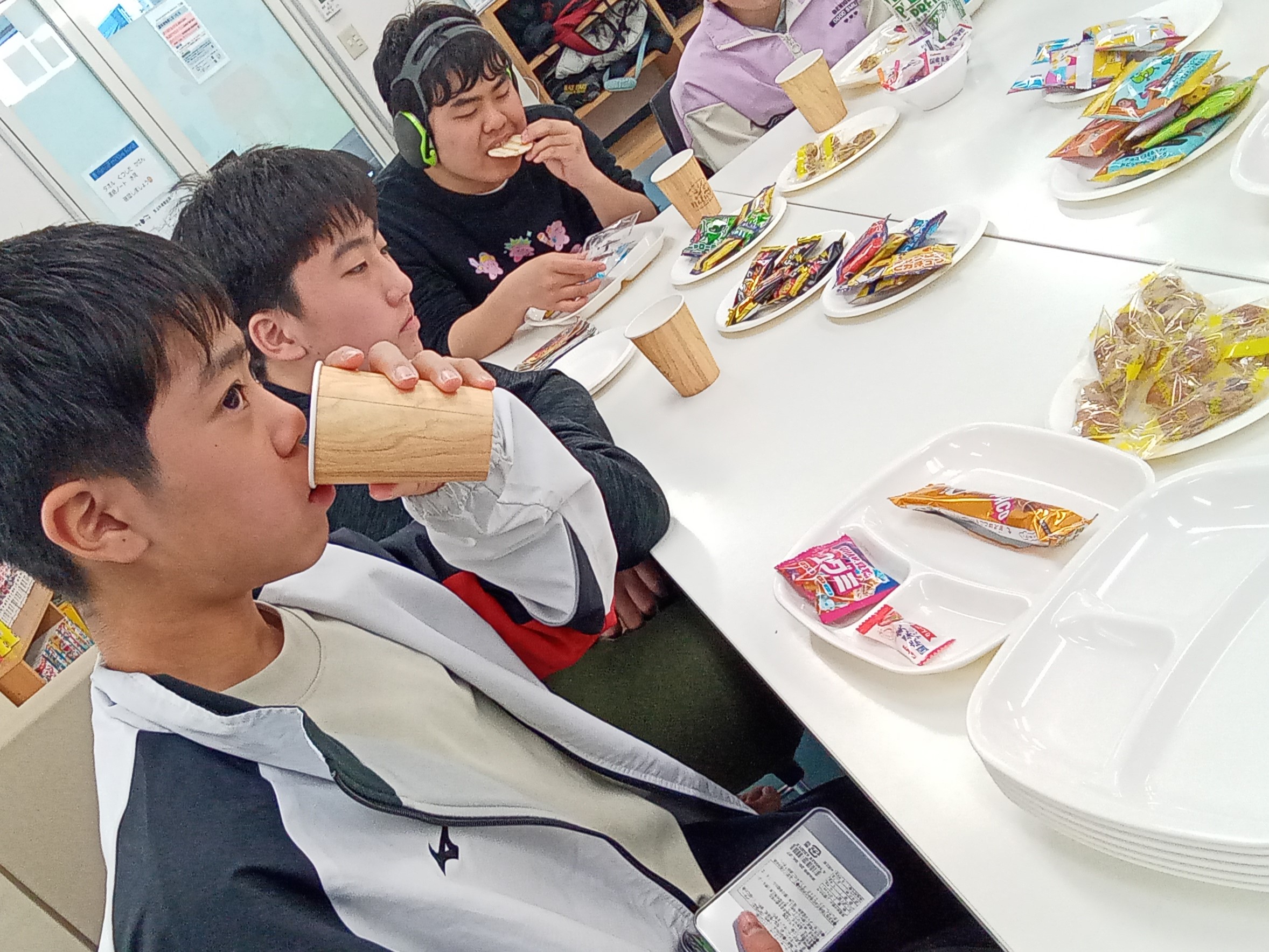 好きなお菓子を自由に食べながら、卒業生の方に「どこで働くのか」「社会人になったら何をするのか」など談笑しました!