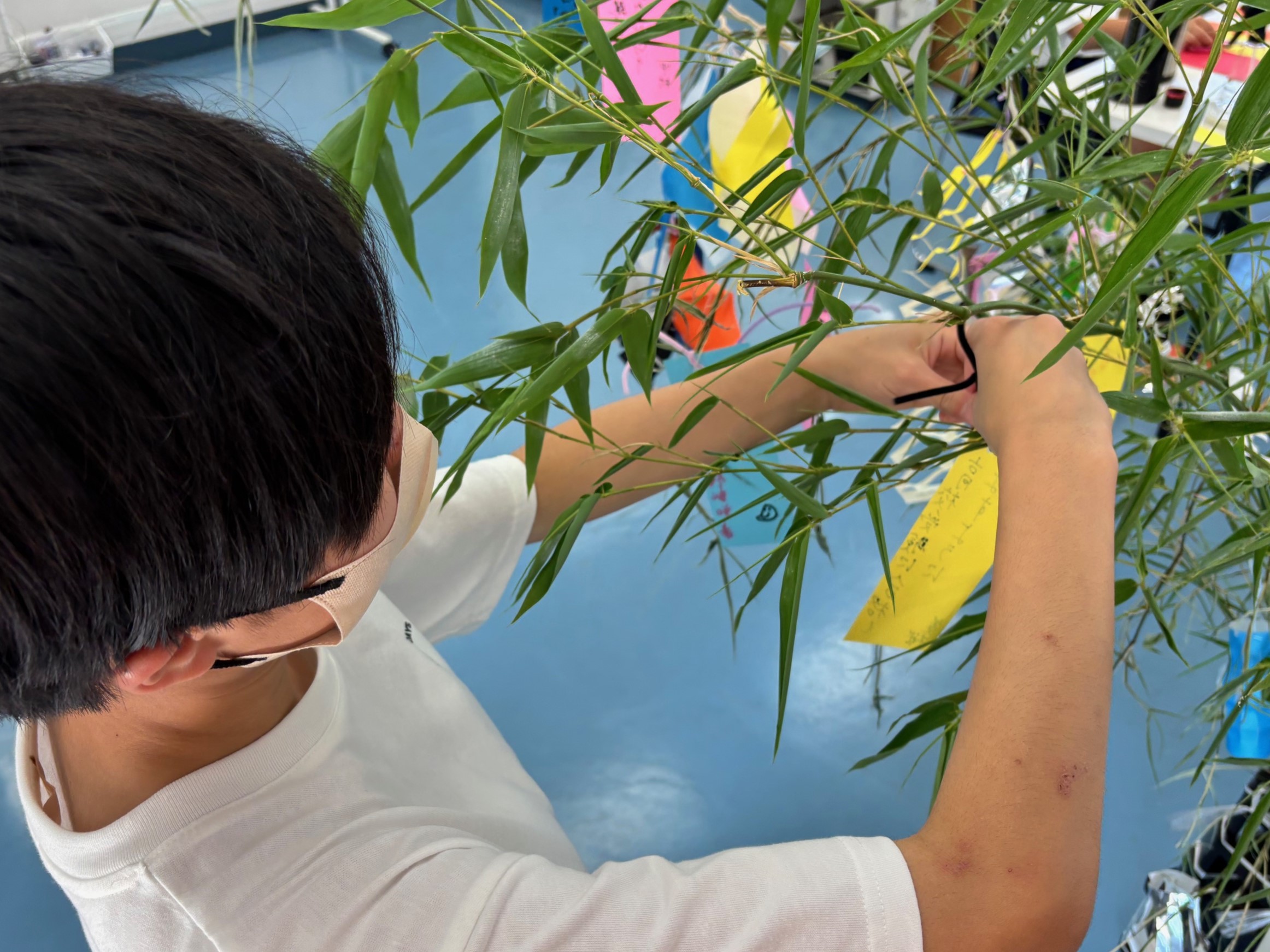 願い事を書いたら七夕飾りと共に笹に掛けていきます。
